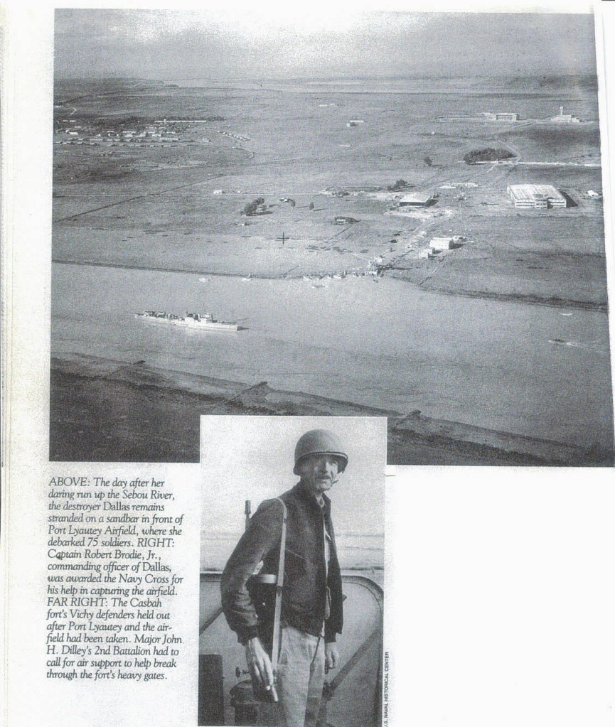 Dad and his shipmates were awarded a Presidential Citation for a particularly brave and difficult mission up the Sebou River in North Africa. Thanks to some clever Internet searches I was able to find a photograph of the Dallas shortly after the battle. I get all choked up thinking that my 18-year-old father is somewhere on that ship.