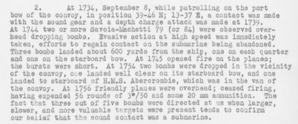 I recently became aware that the Dallas War Diary had been photographed and made available online. While many entries are little more than “Changed course,” there are quite a few that speak of the dangers the sailors faced. One of the most exciting entries comes from 1943. It details how while chasing a submarine, the Dallas came under fire from a small squadron of Savoia-Marchetti 79 Italian bombers. Although they were able to repel the planes, they lost contact with the submarine.