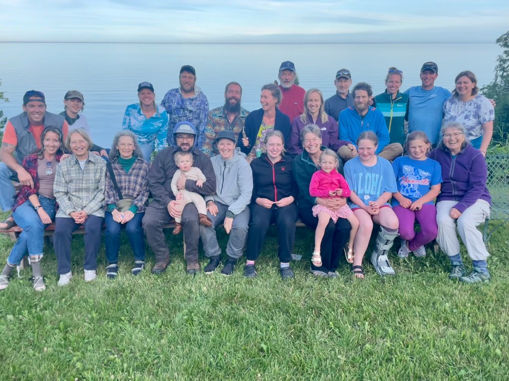 The big gaggle of people is the extended Horak clan. Jan and Kathy Horak own Cobblestone Cabins. These folks have been a part of our family for nearly 40 years. We dine, hike, fish, sing, and sit around and talk together.