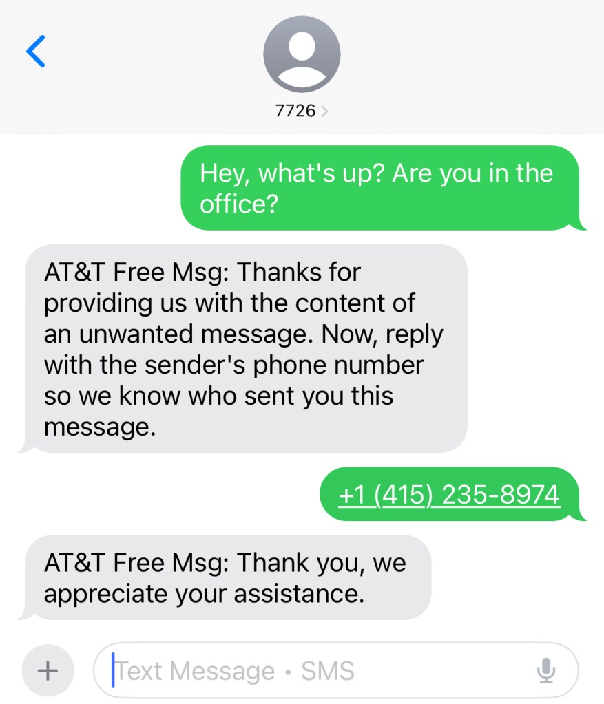 In the United States, scam text messages can be forwarded to 7726 (which happens to spell SPAM on the phone’s keypad). This allows your carrier to continually improve its spam filters.