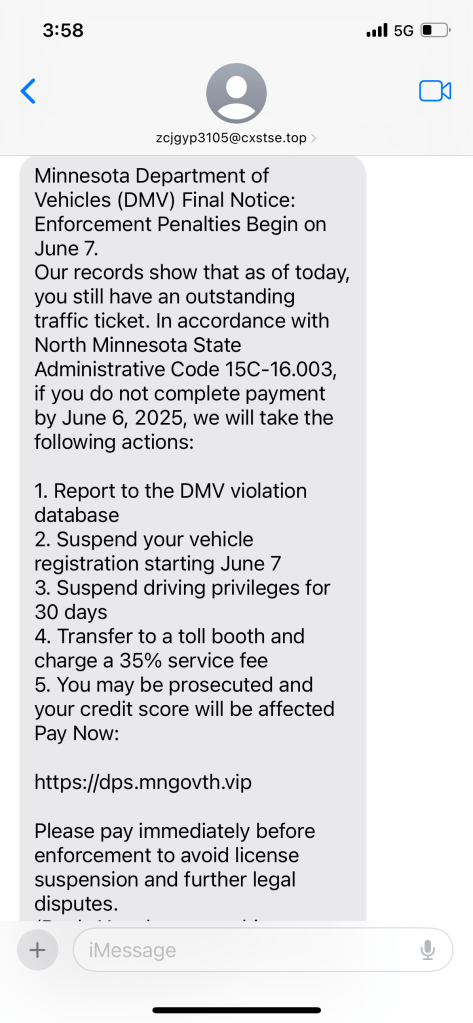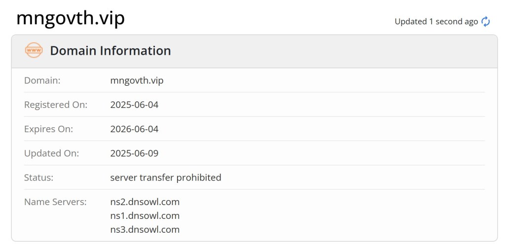 For example, on June 4th I received a text that contained a link with the domain mngovth.vip. This is what I see when I run it through whois. Notice that it was registered the day I received my the text. Red flag!