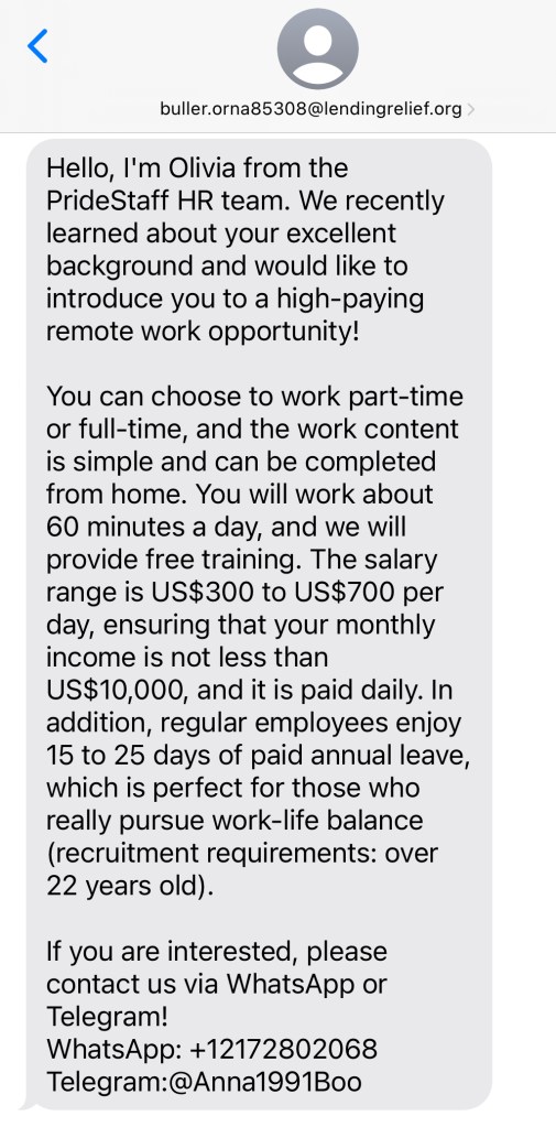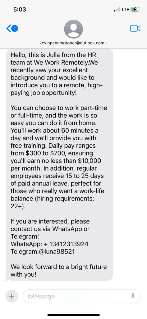 Employment scams are on the rise. They come as texts, emails, or social media direct messages. They offer jobs that are too good to be true in terms of money, hours worked, and benefits. Here are two that I recently received. Notice that other than the contact information, they are nearly identical. Also note that they come from email addresses that have nothing to do with the phony job offers.