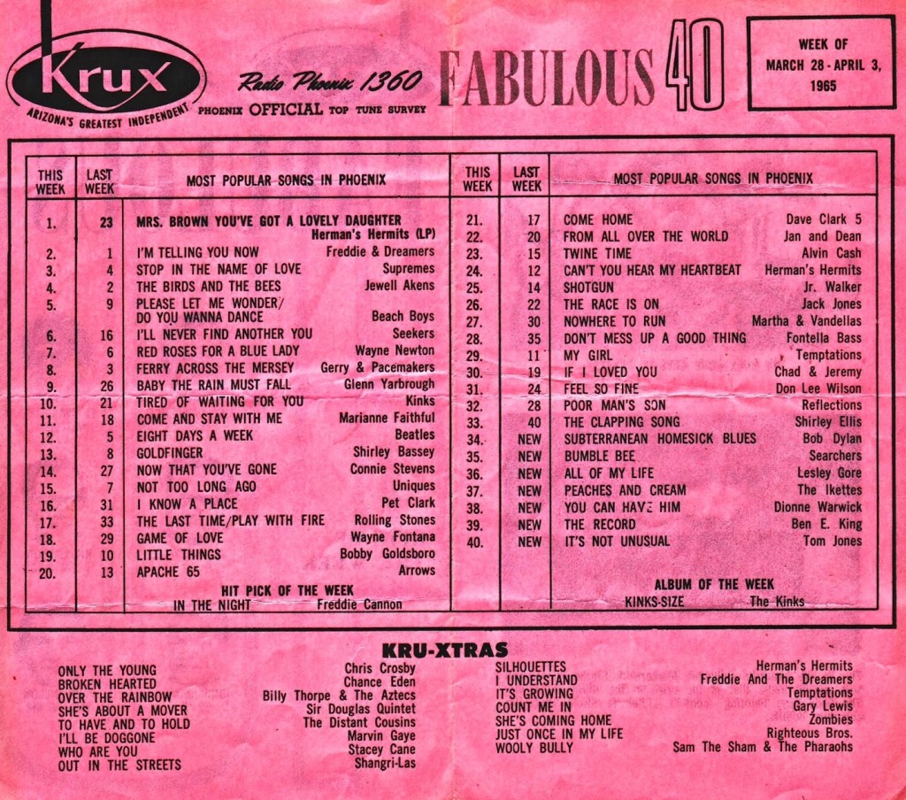 In 1964, as an 8th grade graduation present, my oldest brother, Richard, was given a Motorola tabletop AM/FM radio. I shared a bedroom with him and my next oldest brother, Bob, and can attest to the fact that other than while we were sleeping, that radio was always on. KRIZ and KRUX were the top 40 radio stations in the Phoenix valley and we were a KRUX family. So, despite the fact that I was only six years old in 1964, Richard’s radio allowed me to experience the 1960’s as a teenager. Whether it was the British invasion or the rise of psychedelic music, I was there and soaked it all in.
