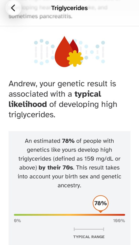 If there is a point to today’s missive, it’s this. I want a life that leaves a great deal of room for mystery. Not only do I not need to know the next ten, twenty, or if I am lucky, thirty years of my life, I do not want to know. I prefer to live without having something ominous hanging over me. Actually, something ominous and yet very unpredictable. A 78% chance of high triglycerides is not a certainty — especially when it’s solely based on my birth sex and ancestry.